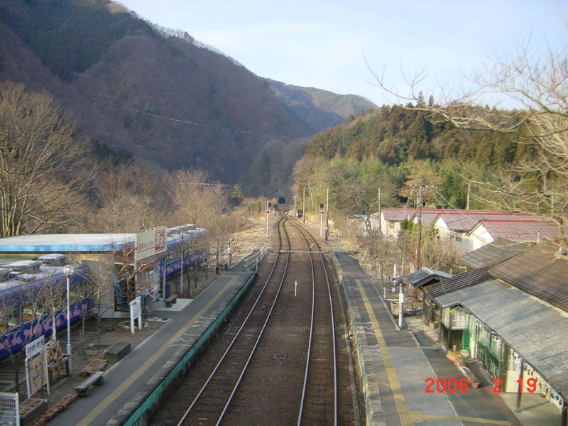 左は、終点、間藤駅。ちょっと近代風ですが、周りは堅そうな岩盤が向きだしの山々です。運が良ければ鹿とか見れるとか。っていうか鹿のフンがあちこちにあったから朝方とかにはだいぶ出るんじゃないかな。右の写真は、間藤駅から北に延びる廃線後。ものすごく狭いところですが、ちゃんとレールが残ってます。こんなところに昔は列車が走っていたのかな。っていうか、手前の岩が崩れてるし。奥にうっすら見える山々は日光です。
