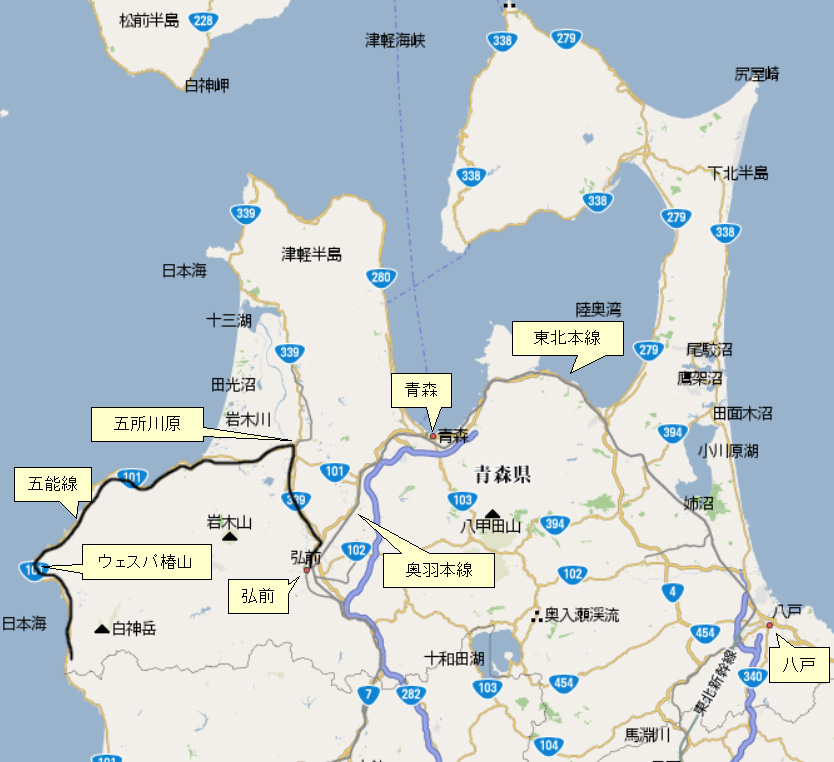 まず、東北新幹線はやてで八戸へ。八戸からは東北本線つがる号青森へ。そこから弘前へ行く予定でしたが、大雪の影響でバタバタしながらその手前の川部で乗り換え。ここから五能線でウェスパ椿山駅まで行きました。帰りはウェスパ椿山の隣の深浦から弘前へ。そこから大雪で列車が止まっていたのでバスで青森まで行き、あとは同じ経路で帰っています。