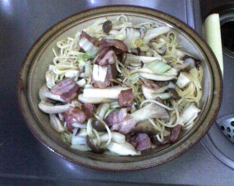 きのこのスパゲティを作ってみました。以前も適当にエリンギとシメジとエノキを炒めて、塩とコショウで味付けしたのを作ったんだけど、ボヤけた味だったので、今回はちゃんと調べて作りました。