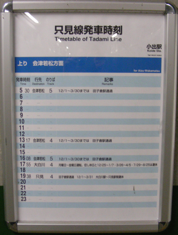只見線の小出駅に着いたのは早朝、とにかくこの時刻表の通り本数が無いので、5時半の始発に乗車しました。