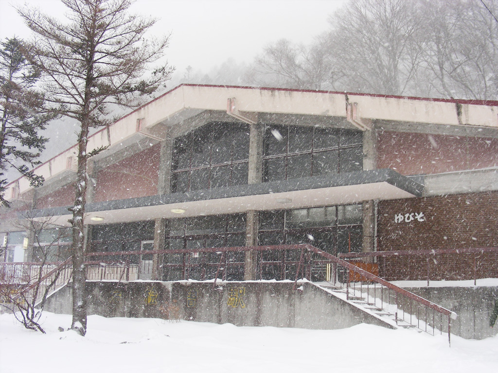 これが土合駅の外。建物はおしゃれっぽい形をしていますが、外は猛吹雪で何もありません。駅の中は自販機がありますが、売っている物は全部コールドですwちなみに我々は小型のキャンプ用ガスコンロを持ってたので、自販機でコーヒーを買って温めて飲んでいました(^^;;待ち時間が1時間以上あったので、この一時に至福を感じてしまうくらいの極地でしたね。