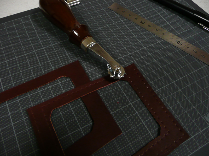 まずはステッチルレットで縫う場所に穴を開けます。これをやる前にシャープペンで線を引いてます。