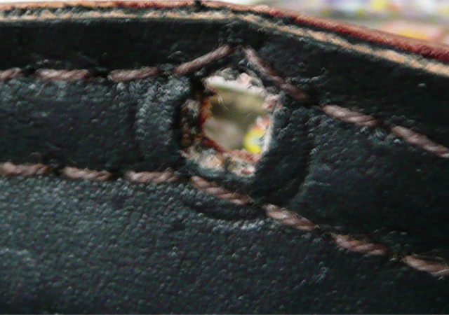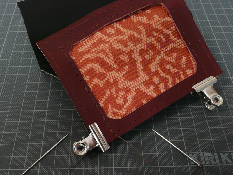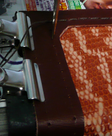 実際には浅い穴しか開かないので、千枚通しで貫通します。複数枚革がある場合は、一緒に貫通します。このときにクリップなどでしっかり固定しないと、すぐにずれて困ります。
