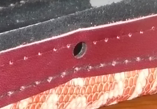 縫い終わったらホックを留める穴を掘ったんですが、全然考えてなかったので、穴あけ場所に困りました。結局糸をほぐして縫い直したりしてます。しかも始めはカッターナイフで穿ってましたが、穴あけ専用のポンチが売ってることに気がついたのはかなり後のことです…