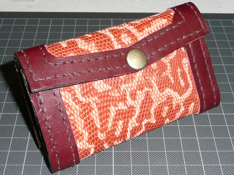 革2は枠と全体の補強用。デザイン用の革が赤系なので、同系色でかつ革1の色を引き立てる為に、若干暗い小豆色にしました。1000円くらい。