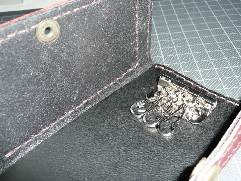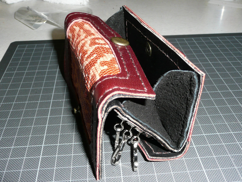 複雑な仕組みなので、かなり厚みがあります。表面的には裏表が同じ形ですが、片側はキーケース。もう片側は小銭入れです。両方開いた写真を見ていただければ、構造がわかりやすいかな。
