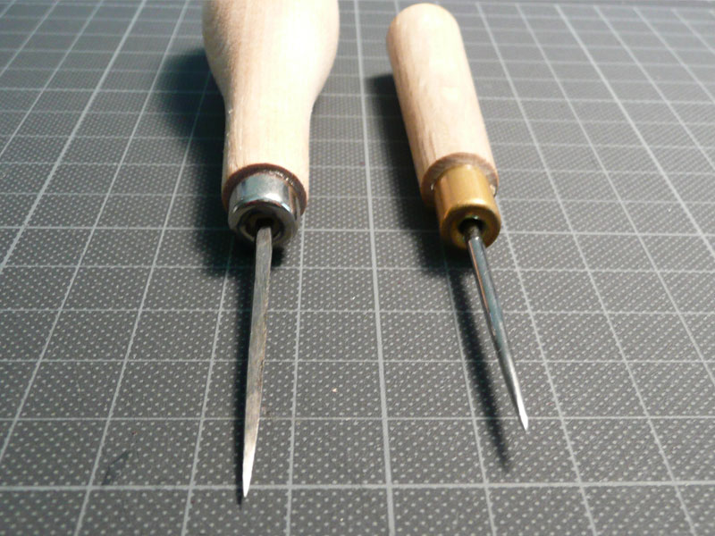 これは菱目抜き(左)。菱目打ちが夜中使えないので、買いました。今までの千枚通し(右)と穴の大きさはほとんど違いが無いですが、糸の通りやすさは抜群です。