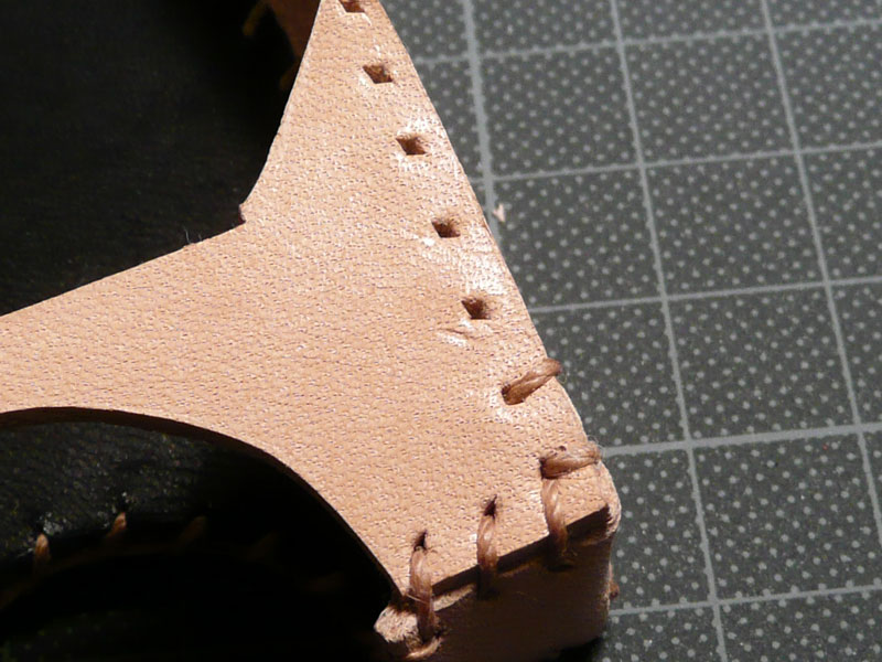 こんな感じの穴が開きます。ちなみにこの縫い方はたぶん悪い例。糸で引っ張られる方向に菱形の先端が来ると強度が落ちますからね