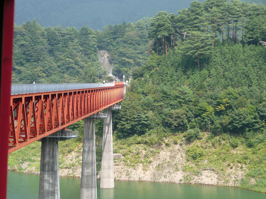 井川線方面へ大井川沿いを上っていくとダムがいくつかあります。この写真は長島ダム。今回もここでは降りませんでしたが、ここも良さそうな観光スポットですね。この時期は災害用にあまり水を蓄えていないようで、湖に沈んだ道や旧井川線がみれます。