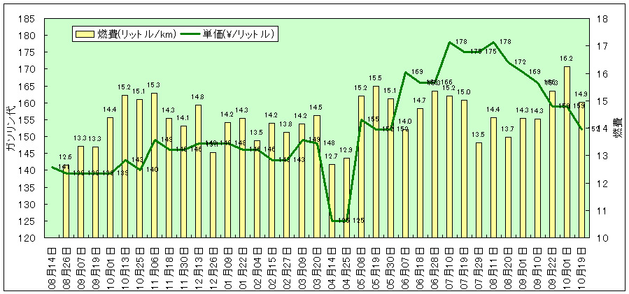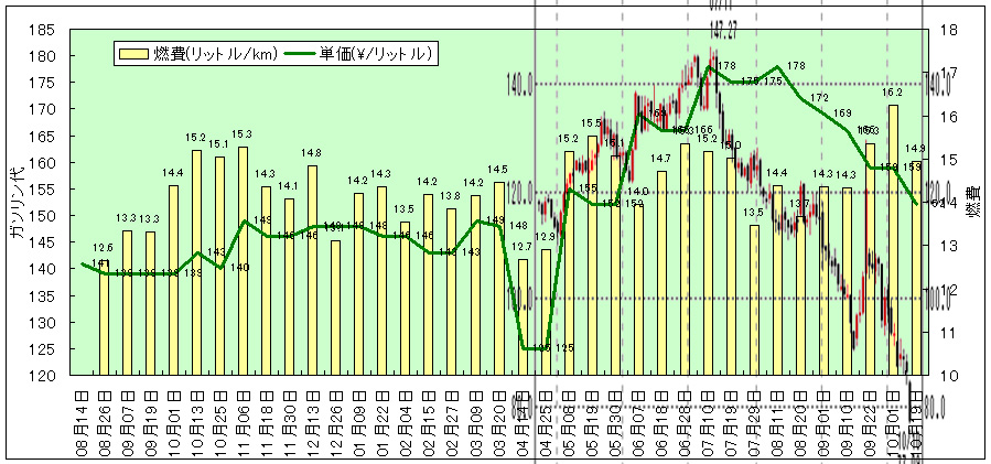 車を買ってからずっと燃費とガソリン代(レギュラーの表示価格)を記録してきたけど、それをまたグラフにしてみた。ちなみにうちの近所は、全国平均より若干安いです。