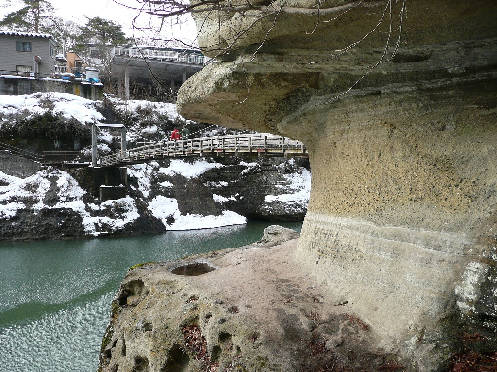 橋の向こうの窪んだところは歩くことができます。狭いし足場は悪いし所々の斜面は急だし所々凍ってるしなどなど…かなり生命の危険を感じますけどね(^^;