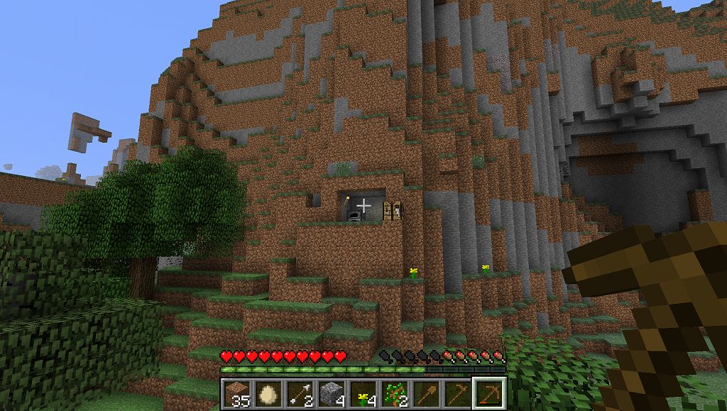 - つるはしで岩を掘って石を入手(素手でも掘れるが、時間がかかるし、そもそも石が入手できない)