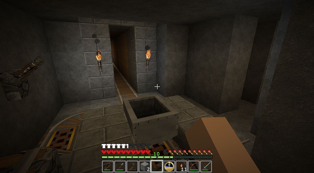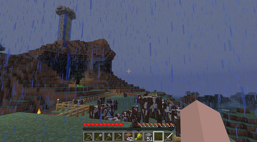 生活基盤はだいたいこのくらいですが、始めに問題になるのは、生活基盤をどこに作るかです。世界生成直後は昼間ですが、すぐに夜になります。夜になると魔物だらけになります。素手では太刀打ち出来ないし、武器を持ってても始めはしょっちゅう死にます。
