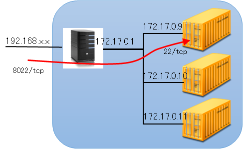 注意としては、「-p 8022:22」というオプションですね。これはホストOSの8022番ポートをコンテナの22番ポートへポートフォワードしているという意味です。コンテナは内部的に「172.17.0.0/16[*]」というIPのLANが生成されます。ですから、外部からのアクセスはホストOSを通じてフォワードされなければなりません。また、22/tcpはホスト側のsshが使っているので使えません。dockerは便利なことに「-p 8022:22」というオプションを付けるだけでこのポートフォワードとポート変換を同時に設定してくれます。