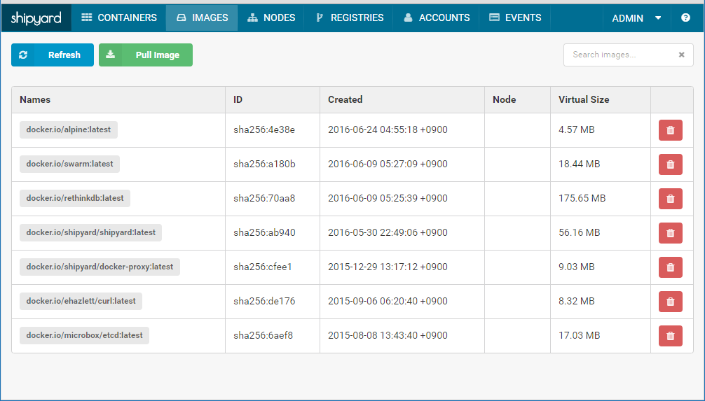 # docker images REPOSITORY TAG IMAGE ID CREATED SIZE docker.io/alpine latest ************ 3 weeks ago 4.795 MB docker.io/swarm latest ************ 5 weeks ago 19.34 MB docker.io/rethinkdb latest ************ 5 weeks ago 184.2 MB docker.io/shipyard/shipyard latest ************ 6 weeks ago 58.89 MB docker.io/shipyard/docker-proxy latest ************ 6 months ago 9.464 MB docker.io/ehazlett/curl latest ************ 10 months ago 8.727 MB docker.io/microbox/etcd latest ************ 11 months ago 17.86 MB