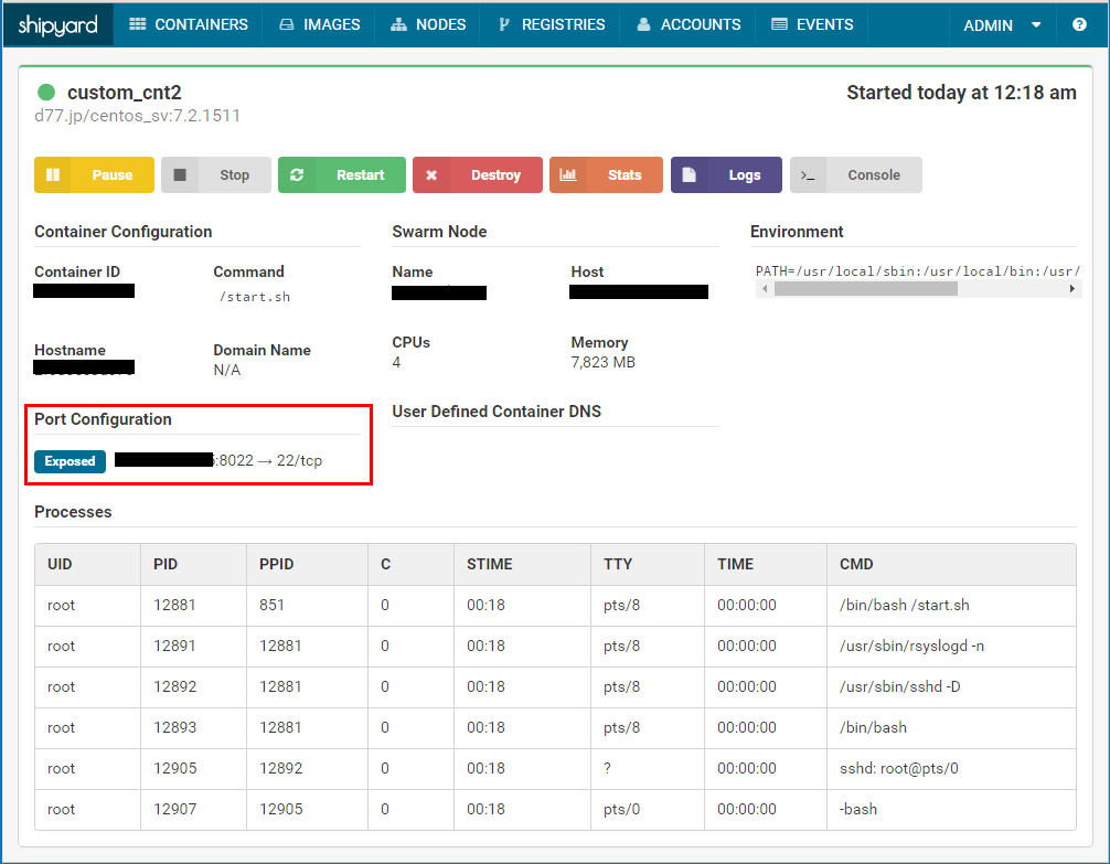 # docker ps CONTAINER ID IMAGE COMMAND CREATED STATUS PORTS NAMES ************ shipyard/shipyard:latest "/bin/controller --de" 33 minutes ago Up 33 minutes 0.0.0.0:8080->8080/tcp shipyard-controller ************ swarm:latest "/swarm j --addr 192." 33 minutes ago Up 33 minutes 2375/tcp shipyard-swarm-agent ************ swarm:latest "/swarm m --replicati" 33 minutes ago Up 33 minutes 2375/tcp shipyard-swarm-manager ************ shipyard/docker-proxy:latest "/usr/local/bin/run" 33 minutes ago Up 33 minutes 0.0.0.0:2375->2375/tcp shipyard-proxy ************ alpine "sh" 33 minutes ago Up 33 minutes shipyard-certs ************ microbox/etcd:latest "/bin/etcd -addr 192." 33 minutes ago Up 33 minutes 0.0.0.0:4001->4001/tcp, 0.0.0.0:7001->7001/tcp shipyard-discovery ************ rethinkdb "rethinkdb --bind all" 34 minutes ago Up 34 minutes 8080/tcp, 28015/tcp, 29015/tcp shipyard-rethinkdb