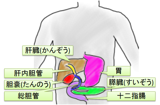 - 総胆管…胆嚢から十二指腸に繋がる管。途中に胆嚢管とかもあるけど略。